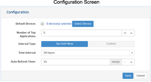 You can configure the report view by clicking on the Configuration icon and customizing the display. The Configuration Screen for the Top N Applications Report is shown below. The configuration options vary depending on the report type. Specific field descriptions are defined in the help pages for each report type. Once you update any options and click on the Save button, reports will be displayed in the new format.