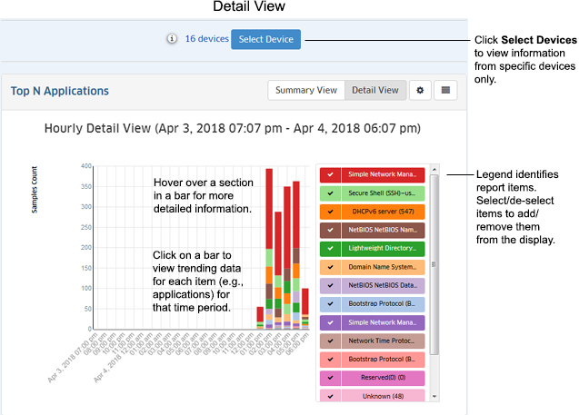 The Detail View displays a detailed subset of the information in bar chart format for the configured time period. For example, if a report is configured to show data for the last 24 hours, the bar chart view would display data for each hour over those 24 hours. The legend identifies each item in the chart by color and text. For example, the legend in a Top N Applications Report (shown below) identifies the applications displayed in the bar chart. (The legend in a Top N Ports Utilization Report would identify the switches/ports displayed.) You can hover over an area in a bar to view detailed information for that item. For example, in the Top N Applications bar chart below, you could hover over an area in a bar to view the number of flows from that application. Or you can click on an item in the legend to isolate the item in the display and show the same detailed information. You can also click select/deselect an item in the legend to add/remove the items from the display. You can also view data trends by "drilling down" on a data set to see a subset of that data.
