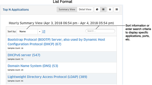 The List Format displays information in list form (e.g., a list of Switches, Applications, or Users displayed from highest to lowest). You can sort the display by specific criteria (e.g., name), sort in ascending/descending order by, or search for and display specific information (e.g., display only a specific application or port number). The example below shows a Top N Applications Report.