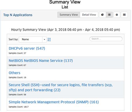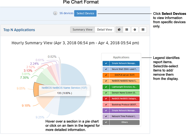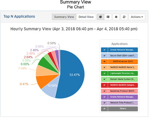The Summary View displays information either in pie chart format, with each entity (e.g., application, client) displayed at a percentage of the total for the configured time period (e.g., 24 hours); or in list format, with each entity listed from highest to lowest. By default, data for the past 24 hours is shown. However, you can change the timeframe, as well as the number of entities displayed (top applications, top ports). The examples below show an Hourly Summary View for the Top N Applications Report.