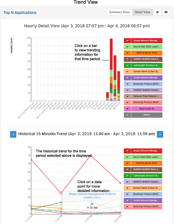 By default, the Summary View is initially displayed for all reports. This may be displayed graphically as a pie chart (e.g., Top N Applications, Top N Ports Utilization) or in a list (e.g., Network Health). The Detail View displays a detailed subset of the information in a bar chart format. While in the Detail View, you can also display an even more detailed subset of the data to view data trends. For example, if a Summary View is displaying data for the last week, the Detail view will display data for each day of the last week; and clicking on a day in the Detail view chart will display data for each hour of that day, enabling you to view hourly data trends.