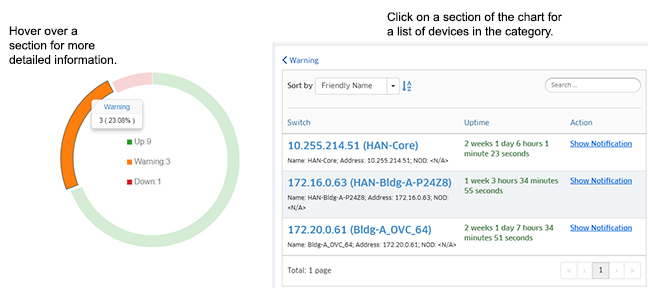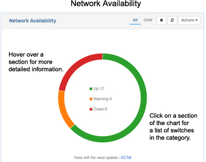 You can view the Network Availability Report in a couple of different ways. Hover the mouse over a category to display a brief summary of the category (the number of switches in the category, along with the percentage of all monitored switches in that category). You can also click on a category to display a list of switches in the category, with specific information about each switch. Click on the "Show Notification" Link to go to the Notifications application and view notifications for the selected device. Click on the "Back" link (<) to return to the default view.