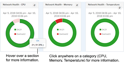 The main Network Health Screen provides a status overview for all network devices for each health category (CPU, Memory, Temperature). Each category displays an overview of the number of devices over threshold (Overload) and within threshold (OK). Hover over a section in the widget for more information. Click on a widget to go the an overview page for a health category (e.g., CPU, Memory, Temperature). From there, you can view a detailed list of devices in each health state (Overload/OK), and set thresholds for each Health Category.