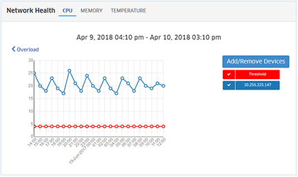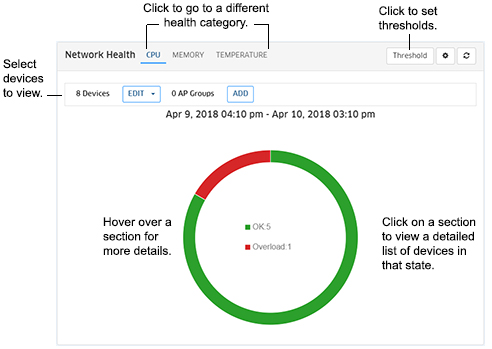 Click on a Health Category on the overview page to view more detailed information for that category (e.g., CPU). Click on the Devices or AP Groups ADD button and select the devices you want to view. Click on the EDIT buton to select different devices. Hover over a section for more information on that state (Overload, OK). Click on a section to view a detailed list of devices in that state. You can also click on the Threshold button to set device thresholds for the Health Category.