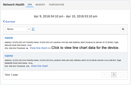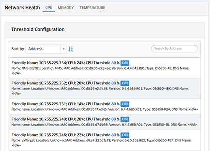 The Analytics Network Health Report Screen displays the health of all discovered network devices in terms of CPU, Memory, Temperature. The widgets on the page provide a status overview for all network devices for each health category. Hover over an area in the widget for more information. Click on a widget to bring up an overview screen for a specific health category (CPU, Memory, Temperature), where you can view detailed information on each network device and set health thresholds for devices.