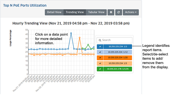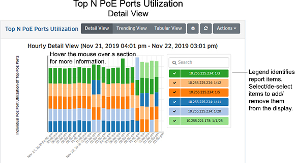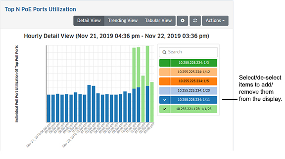 The Top N Ports Utilization can be displayed in a Detail View, Trending, or Tabular View. The Detail View provides PoE port utilization for the configured time interval (e.g., last 24 hours) in a bar chart format. The Trending View displays PoE port utilization for each port in a line chart for the configured time interval. The Tabular View brings up the Discovery Ports Screen, and provides detailed port information (including PoE information) for all ports included in the Profile.