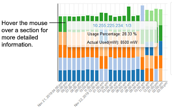 Hover the mouse over a section of the chart to view the detailed utilization information about a port. In the example below, which shows hourly usage, hovering over a section of a bar chart shows port 1/3 on switch 10.255.225.234 with a PoE utilization of 28.33% (8,500 mW) of the total power available for that port for that hour.