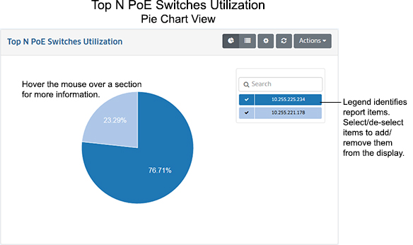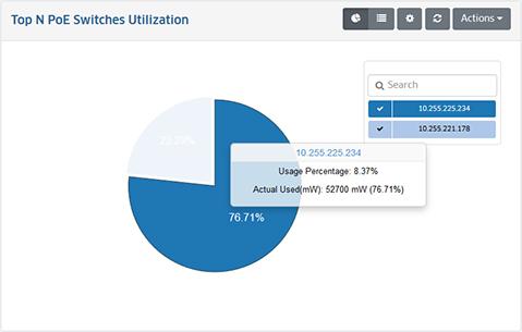 The Top N PoE Switches Utilization Report can be displayed in a Pie Chart View or a List View. In the Pie Chart View, switches are displayed in a pie chart with the total amount of PoE power each switch is using based on the total number of switches being displayed (e.g., Top 5, Top 10).