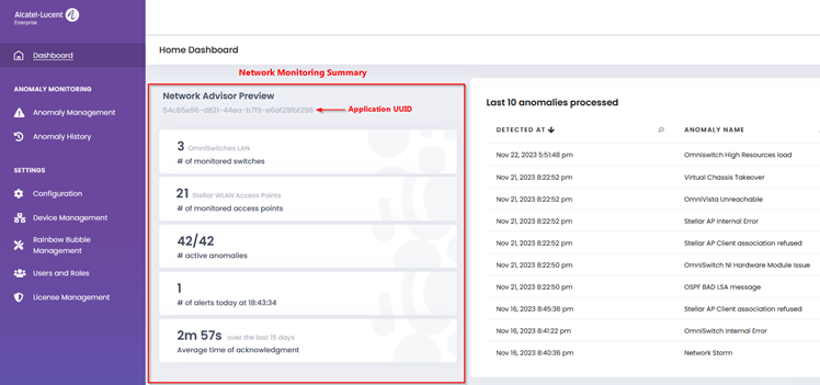 OmniVista Network Advisor is an important troubleshooting tool that you can use to monitor the network and take action to correct any detected network problems. When Network Advisor monitoring is enabled for a device(s), the device begins to send Syslog messages to the specified OmniVista Network Advisor instance. Network Advisor analyzes Syslog messages received from monitored devices to identify anomalies in the network. When an anomaly is detected, Network Advisor notifies system administrators and other authorized persons through Rainbow. Anomaly notifications can alert those receiving notifications that something, potentially serious, has taken place and even suggest steps to immediately remediate the problem.