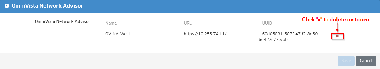 To remove a Network Advisor Instance, make sure the instance is not assigned to any devices, then click the "More" link on the OmniVista Network Advisor widget to open the OmniVista Network Advisor dialogue window. Click on the x next to each instance that you want to remove.