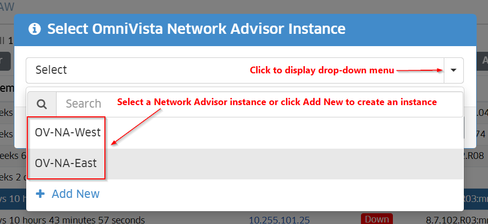 Network Advisor monitoring is enabled on one or more devices by selecting device(s) in the Managed Devices List. then clicking on Features and selecting Enable OmniVista Network Advisor from the drop-down list. The "Select OmniVista Network Advisor Instance" dialog opens. Select the Network Advisor instance that you want to monitor your devices from the drop-down list and click OK. You can also click Add New to create a new instance to add to the list.