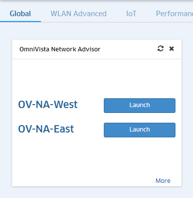 To declare Network Advisor instances to access in OmniVista Cirrus, a Network Advisor application widget is available to add to the Global Dashboard of the OmniVista Cirrus Home page. This widget displays a list of Network Advisor instances that are available to assign to managed devices. You can also open the website for a specific instance by clicking on Launch next to the list entry. To add or remove a Network Advisor instance, click the "More" link on the widget.
