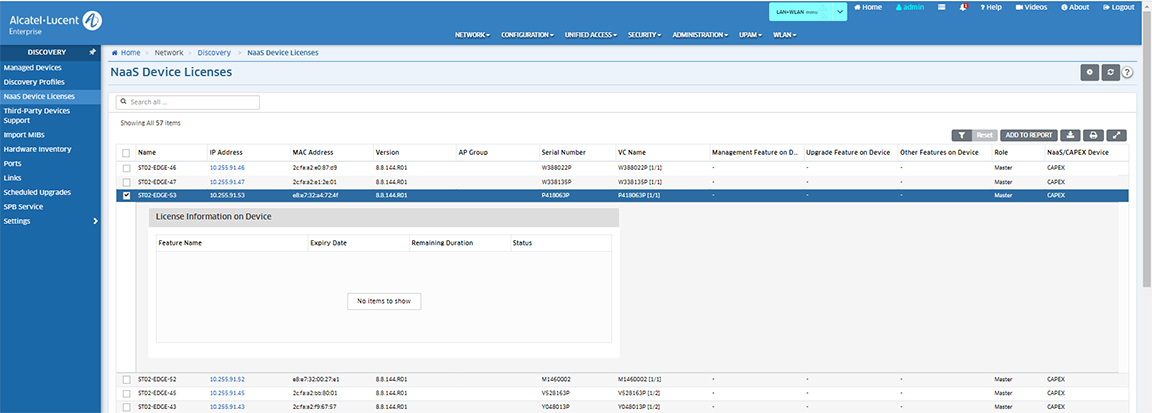 The Inventory NaaS Device Licenses Screen displays the NaaS Device Licensing information for discovered switches running AOS Release 8.8R1 or higher. Use this screen to determine and monitor the status of the Device License for each device.