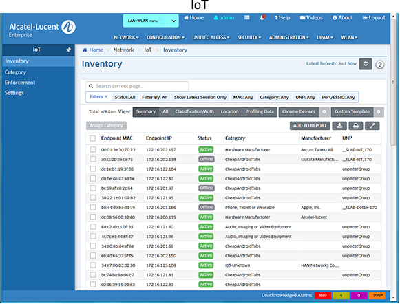 The IoT application provides a detailed view of all endpoint devices connected to AOS Switches and APs (e.g., PCs, Tablets, Smartphones). OmniVista used information received from AOS Switches and APs to track and categorize these devices and presents detailed information for the devices on the Inventory Screen. The application can also be configured to integrate with Google Workspace to collect device information and provide network security for Chrome devices; and can discover, enable/disable, and provide information on Zigbee devices. An overview of IoT functionality, as well as troubleshooting tips are provided below.