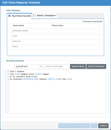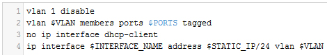 A Dynamic Template (see sample below) is a template with variables. It allows you to reuse the same Configuration Template even though different switches might need different values for some configurations. For example, different branches of an enterprise might use a different subnet range or VLAN.
