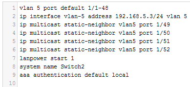 The Configuration Template is created using CLI syntax. A Configuration Template is a set of commands that are read by the switch on reloading. A template can be static or dynamic. A Static Template (see sample below) is a template without variables. It is useful for deployments where all switches can work with exactly the same configurations. The IP address is typically given by a DHCP server in such a deployment.