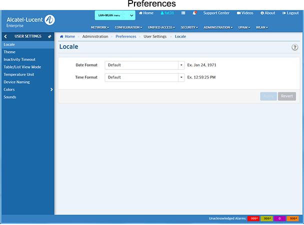 The Preferences Application is used to set OmniVista Cirrus preferences for the web GUI. All Preferences have appropriate default values, so there is no need to change Preference settings unless you wish to. When a Preference is changed, the change takes effect immediately.