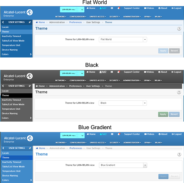 The Preferences Theme Screen is used to set the color scheme and look of OmniVista Cirrus. Select a theme and click the Apply button. The change takes effect immediately. The available themes are shown below.