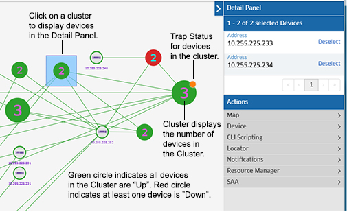 If all devices in a cluster are "Up", the cluster circle displays in Green. If any device in the cluster is "Down", the cluster circle displays in Red. Click on a cluster to display all of the devices in the cluster in the Detail Panel. You can then click on a device to view device details or perform an action on the device.
