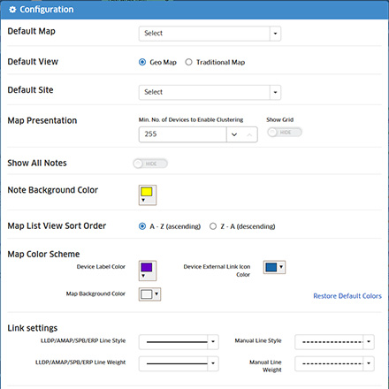 You can change the default map preferences (e.g., Default View, map colors, link priority) by clicking on the Configuration icon at the top right corner of the map to bring up the Configuration Window (shown below). Set a preference(s) and click on the Save button. The changes will take effect immediately.