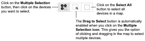You can select a single device in a map to perform an action by clicking on the device. If you want to select multiple devices for an action, click on the Multiple Selection button at the top of the map, and click on the devices you want to select. When you click on the Multiple Selection button, the Drag to Select button is also enabled. At this point, you can either click on multiple devices to select them, or click and hold the mouse button to drag and select multiple devices. You can also select all devices in a map by clicking on the Select All button at the top of the map.
