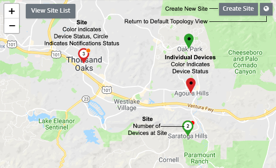 Click on the View Site List button to view a list of Sites. You can then click on a Site in the list to center the map on the site. Click on the Create Site button to create a new Site (you can also click on the + icon at the top of the Site List to create a new Site). Click on the Topology View icon next to the Create Site button to return to the traditional Topology Map view.