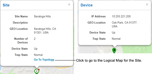 You can hover the mouse over a Site or an individual device for more detailed information. When you hover over a Site, a "Go To Topology" link is also displayed. Click on the link to go the Logical Map for the Site. Sites can only be edited/deleted from the Logical Map.