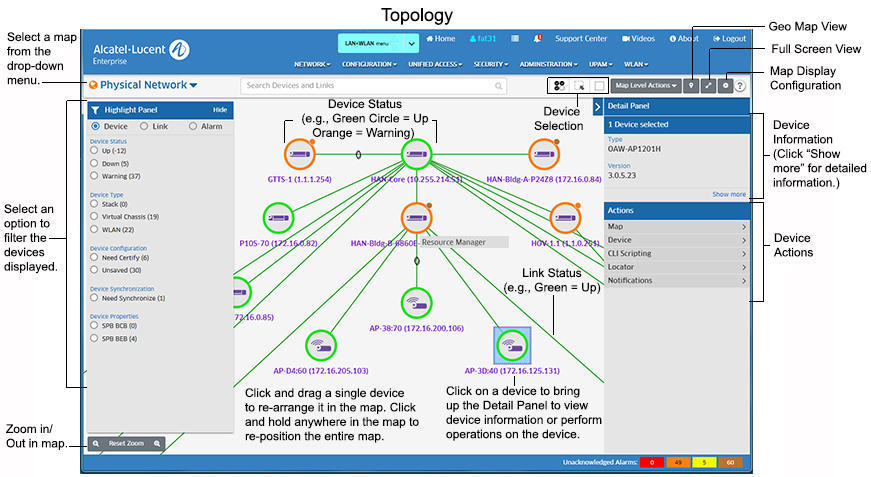 This section details the traditional Topology Map view. In this view, you can highlight devices or links by different criteria (e.g., device type, device admin state, link admin state, alarm severity), change the map layout, search for specific devices in the map, or create maps. Note that the maps that you can view and the tasks you can perform in Topology (e.g., creating maps, creating devices) depend on your User Role and User Group (e.g., Administrator, Network Administrator) as defined in the Users and User Groups application).