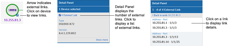 Note that when viewing a map, devices linked to a device in another map display an External Link arrow icon, as shown below. When you click on one of these devices, a link to display a list of external links appears at the top of the Detail Panel (e.g., "1 External Link", "4 External Links"). Click to display a list of external links, then click on a link in the list to display link details.