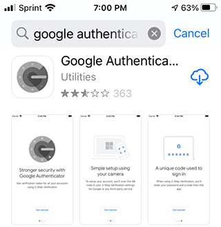 1. Go to the Google Play App Store or the Apple App Store and download the Google Authenticator App to you phone.