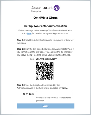 4. Enter the code for your user account into the TOTP Code Field on the OmniVista Cirrus Login Screen and click Verify to log into OmniVista Cirrus. If you have more than one user account set up in the Google Authenticator App, make sure you are entering the code for the correct account.