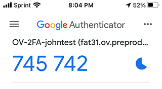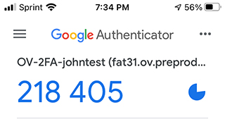 When you scan the QR Code into the Google Authenticator App, the App sets up your account and stores your username (e.g., OV-2FA-johntest) and the URL of the machine you are logging into (fat31.ov.preprod.ovcirrus.com). As shown above, a 6-digit login code is displayed under your username and URL. Note that the code is good for 30 seconds. A countdown clock is shown to the right of the code. When then timer is close to expiring, the code numbers will turn red. When the countdown is complete, a new code will be displayed for 30 seconds.