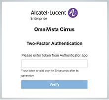 2. After entering your login/password on the OmniVista Cirrus Login Screen, the following Two-Factor Authentication Screen will appear.