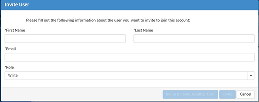 2. Complete the fields as described below, the click on the Invite button at the bottom of the window. You can also click on the Invite & Invite Another User button to quickly return to the window and invite additional users.