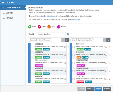 There are different licenses for different device types. When you select a switch in the License Wizard, the applicable license is applied to the device.