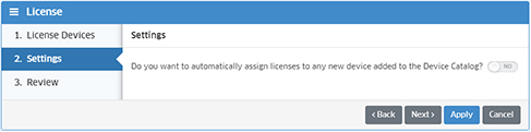 The Settings Screen (above) allows you to enable automatic licensing of any devices you add to the Device Catalog in the future. Once a device is Validated and Registered, it will automatically be assigned an available license, saving you the time of manually licensing any new devices. Move the slider to Yes to enable this option. This option can by turned off at any time. Click Next to review your licensing configuration.
