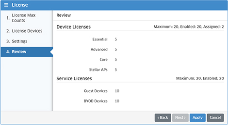 Note: Service Licenses are included as part of a Stellar AP NaaS License. Each Stellar AP NaaS License includes 100 Guest Device Licenses and 100 BYOD Device Licenses.
