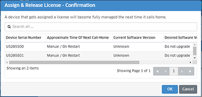 Click Apply. The Assign & Release License - Confirmation Screen will appear, displaying a list of the devices you selected to license.