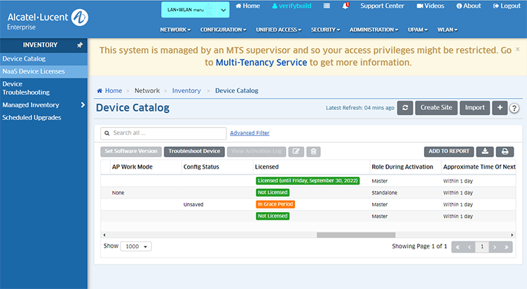 The "License" field in the Device Catalog will display values similar to what is displayed in the "Status" field of the NaaS Device Licenses Screen when OmniVista Cirrus is operating in the NaaS mode. Note that the values for the Device Catalog "License" field are derived from the OmniVista Cirrus Management feature license status. For example, Not Licensed, Licensed (Until <date>), In Grace Period.