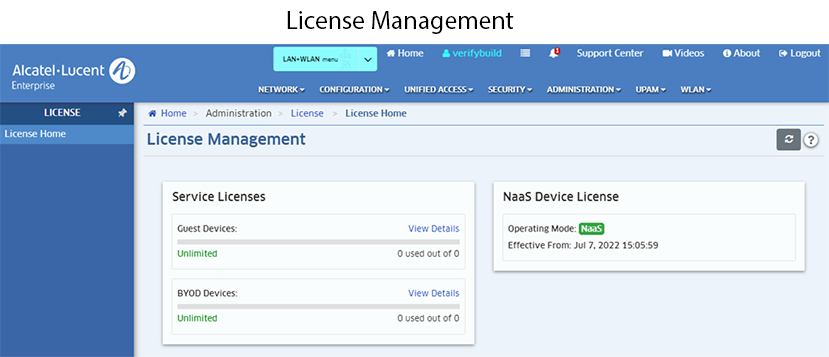 When OmniVista Cirrus is operating in the NaaS mode, any number of devices can be managed as long as the devices report that they have a valid OmniVista Cirrus Management feature license when they call-home. In addition, the License Management Screen display will change to show that OmniVista Cirrus is operating in the NaaS mode, when the mode changed to NaaS, and the number of Service Licenses for Guest and BYOD devices.