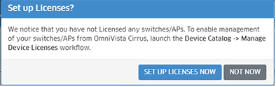 Click on the SET UP LICENSES NOW button to go to the Device Catalog Screen and license devices for full management. Click on NOT NOW to go to the Dashboard. You can set up licensing at any time from the Device Catalog Screen (Network - Inventory - Device Catalog). Remember, any devices you added in your Freemium Account will still be in your Device Catalog, but will have limited management until they are licensed.